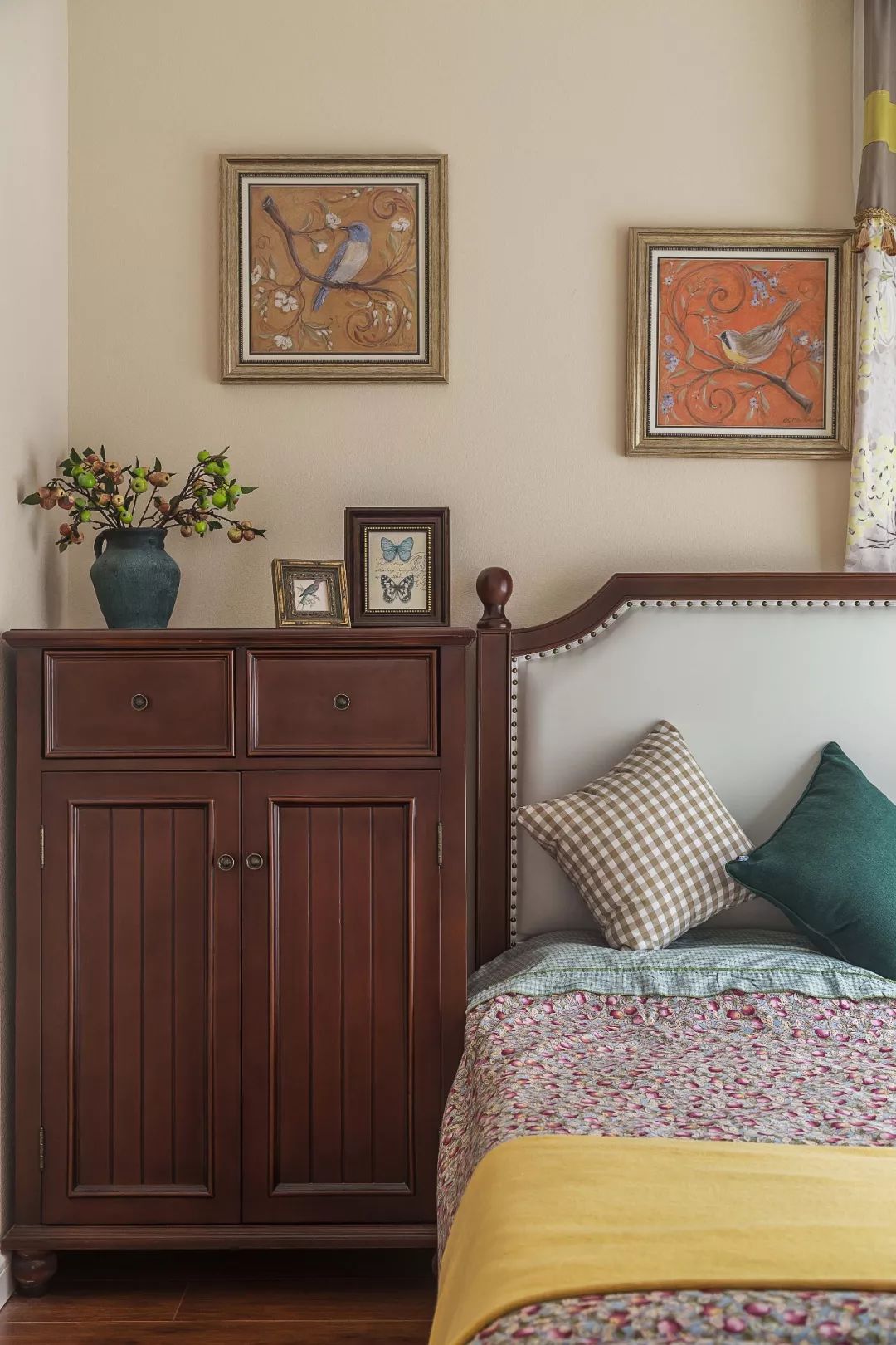 次臥面積相對較小,將一側床頭柜換成了頭柜,不影響美觀,也很實用。