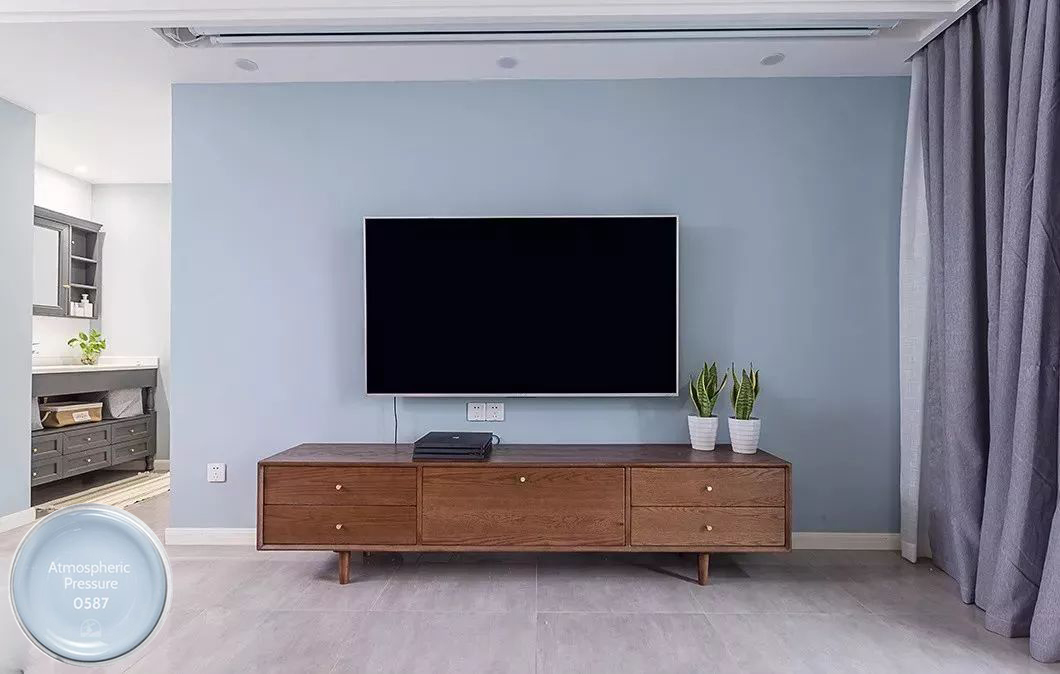 電視背景墻上沒有做任何裝飾,簡單的刷上藍(lán)色乳膠漆就好。客廳的側(cè)邊就是衛(wèi)生間的干區(qū),洗手臺(tái)剛好被嵌入進(jìn)了凹槽內(nèi)。