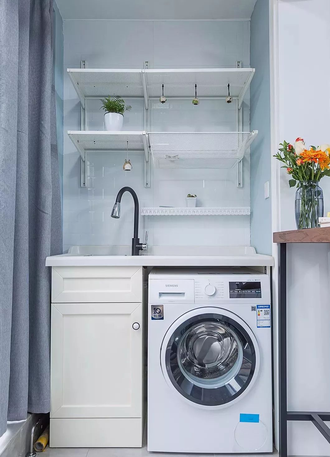 客廳和陽臺(tái)直接也沒有隔斷,這樣看起來會(huì)更寬敞一些。陽臺(tái)的一側(cè)做了洗衣機(jī)、洗手臺(tái)和隔板架的設(shè)計(jì),滿足收納和實(shí)用性。