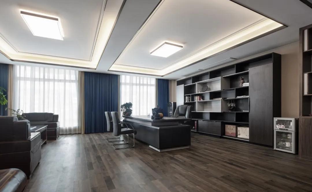 董事長辦公室的書架將書籍資料高效地分類歸納,錯落有致的擺放,使書架又成為精致的背景墻,獨特不落俗套。深色的家具和同色系的木紋地板,統一了整體風格,自律而莊嚴。淺色系和藍色系的窗簾又柔和了過于硬朗的氛圍,使得工作氛圍多了一絲明快與愜意。