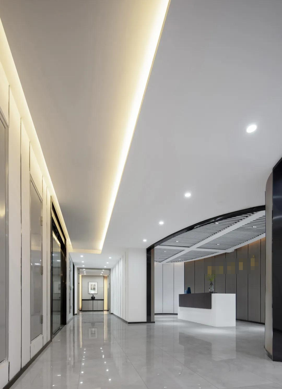 燈光設計是體現設計靈魂的手段,走廊的燈光是本案設計的一大亮點,暖色的燈帶恰到好處地點綴在走廊墻壁內,一扇一扇的墻體,通過燈光的反射,錯錯落落都亮了起來,另一面墻面造型采用規律的線條裝飾,延伸了走廊空間,辦公區分別規劃在走廊的兩側,使整體空間區域井然有序。