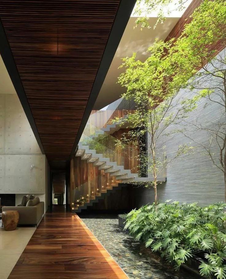 在設計下沉式庭院時,很多人都會選擇半封閉性設計,采用具有防水、隔熱功能的透明玻璃,再搭配木質或金屬橫梁作為支撐,從而營造出更為靜謐的空間。