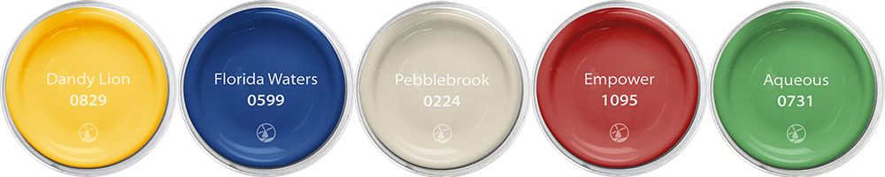 Here, the palette is used to transform a school’s facade. Neutral Pebblebrook is used as a base with eye-catching window frames in the palette’s primary and secondary hues.